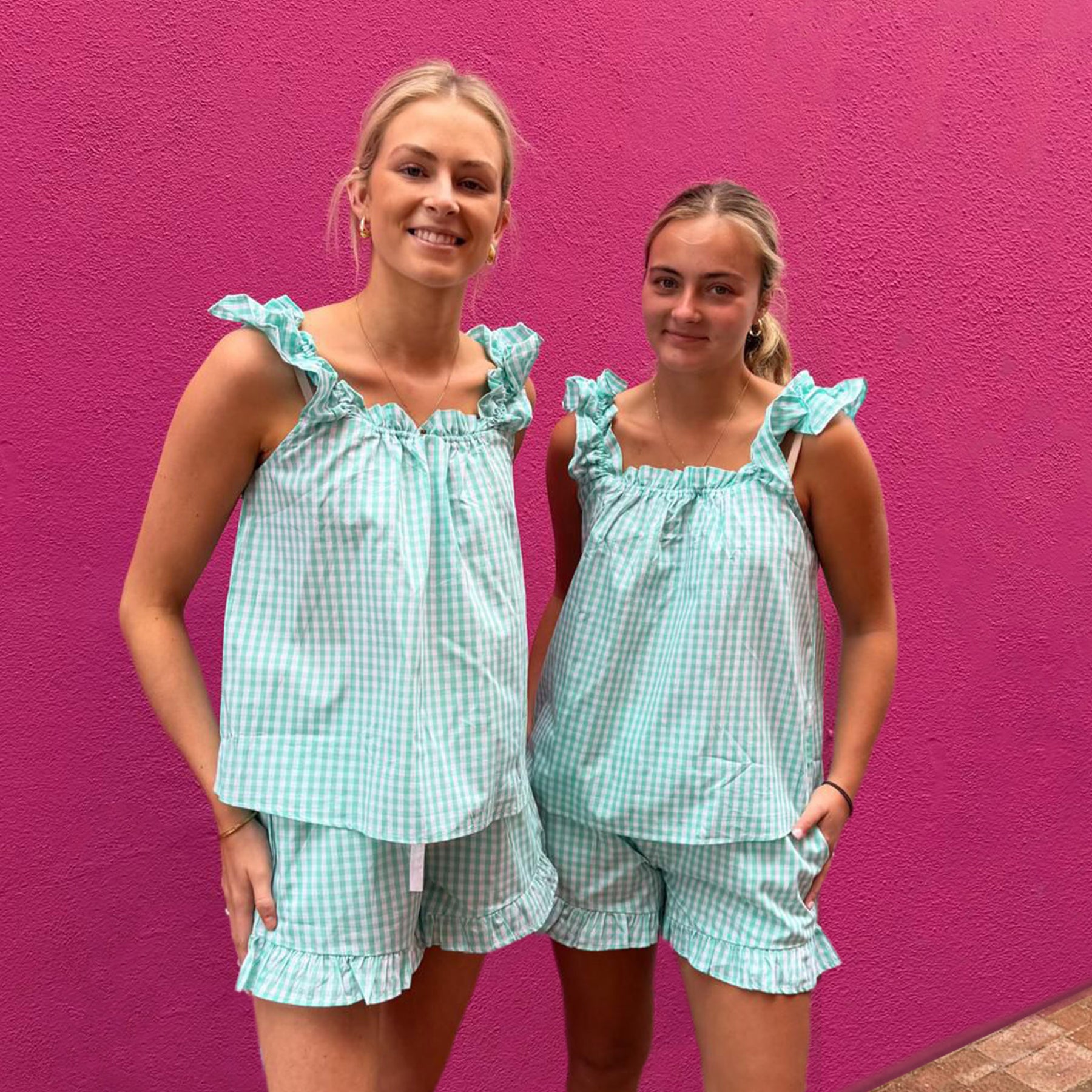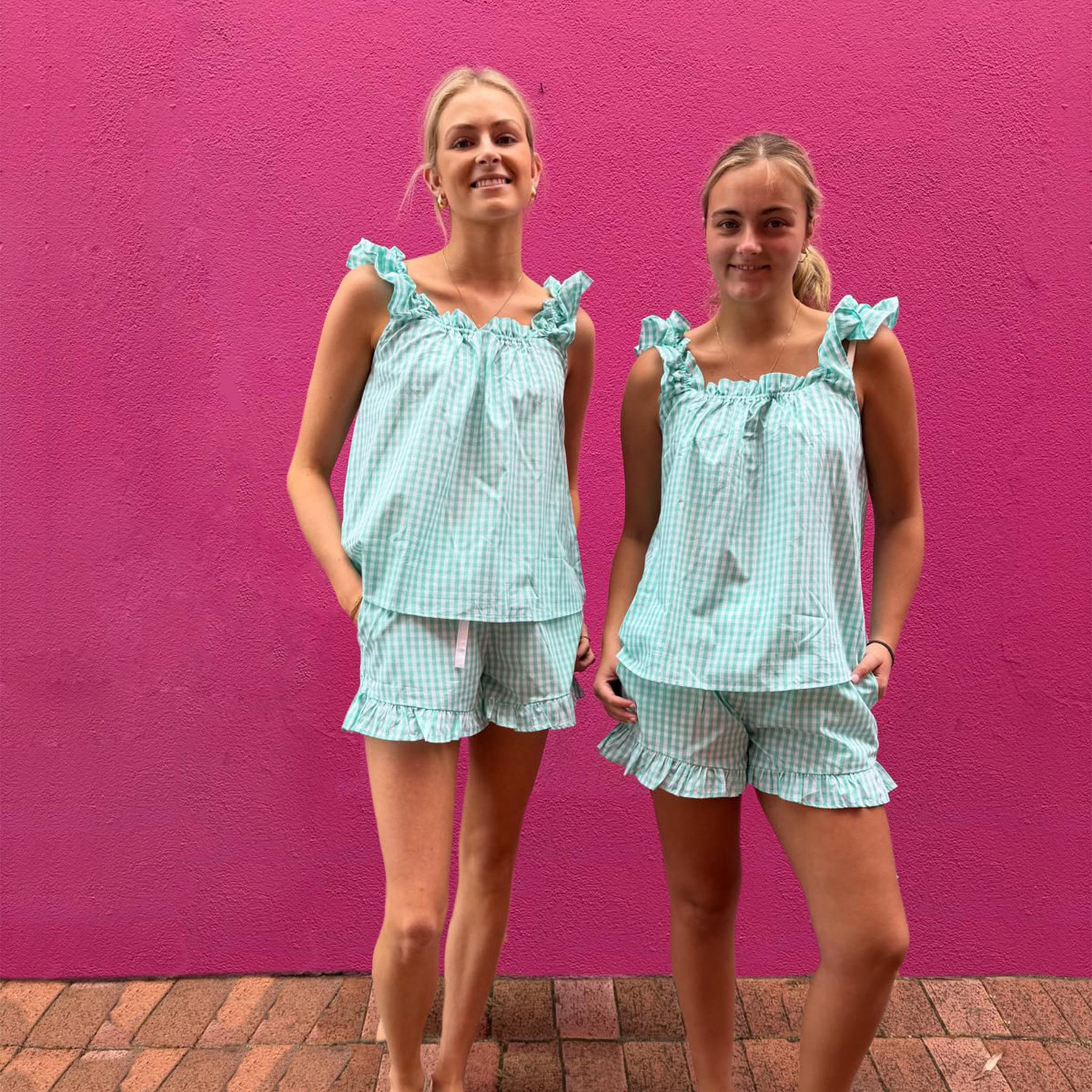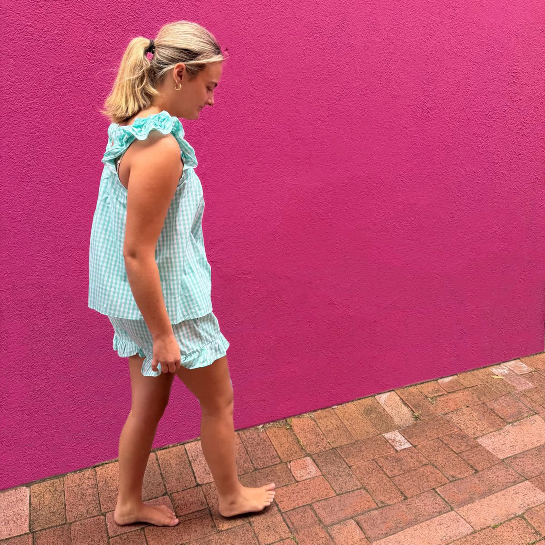 The Mint Gingham Print is a classic addition to our sleepwear collection. Elegant and timeless, this super comfy set features a romantic frill tank top paired with frill boxer shorts.