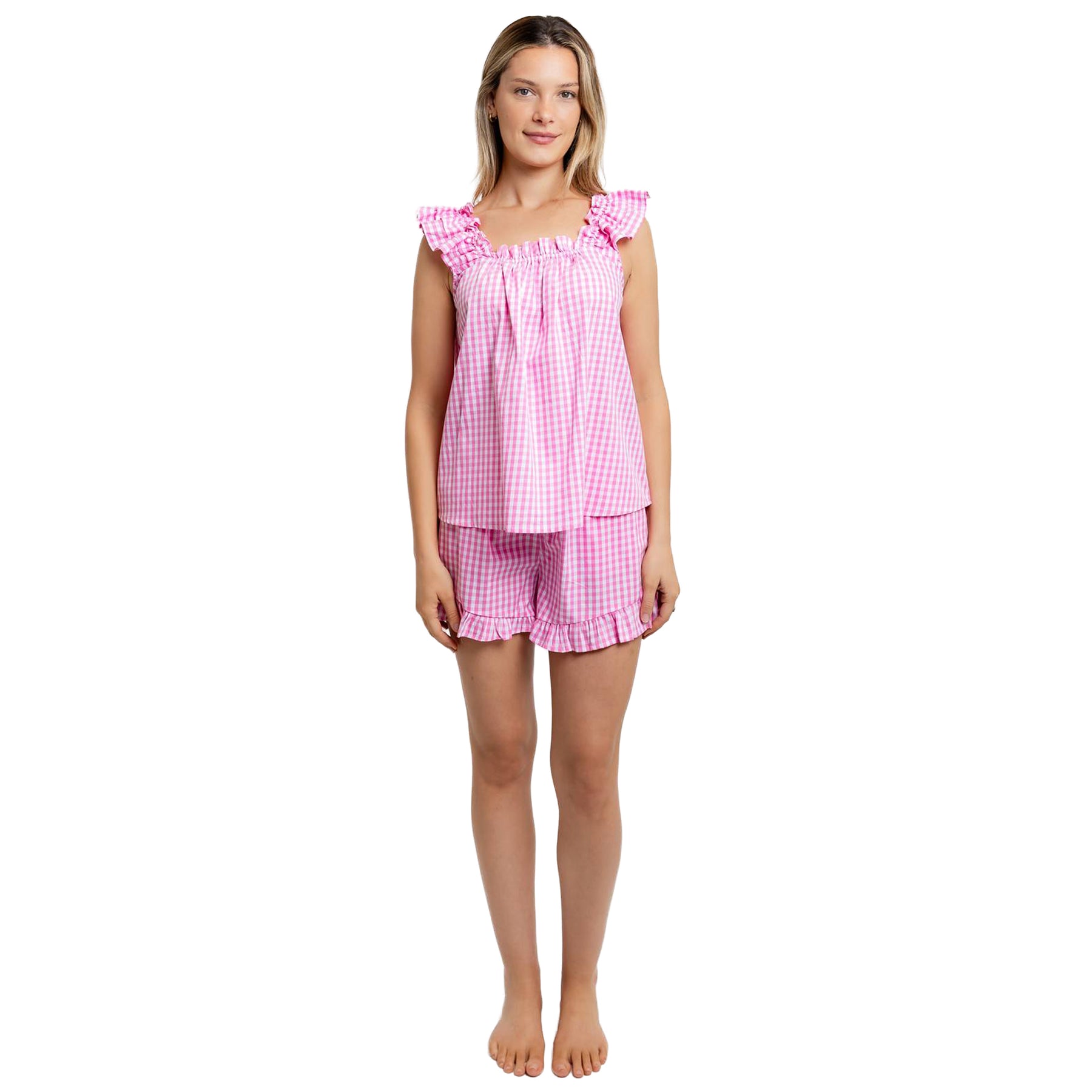 The Pink Gingham Print is a classic addition to our sleepwear collection. Elegant and timeless, this super comfy set features a romantic frill tank top paired with frill boxer shorts.